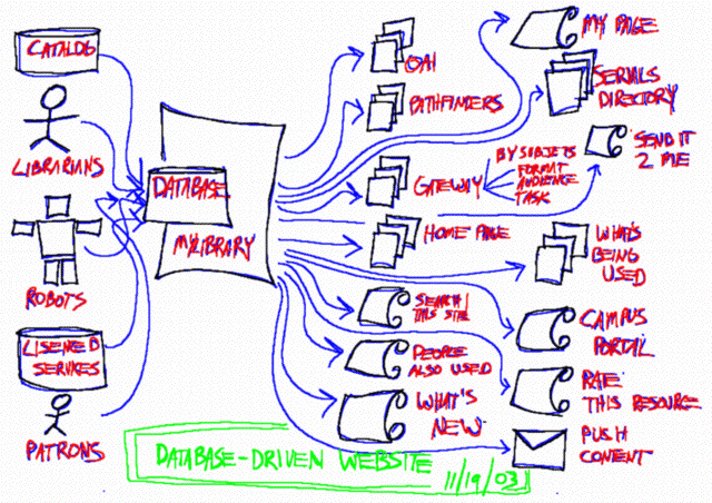 The Libraries previous website had been in existence for a number of years. More than four or five. It had been grown and maintained rather organically. After pursuing the site it became apparent its overall implementation was very much like the library's organizational chart. There were distinct areas for reference, collection development, special collections, electronic resources, plus a few others. Each section sported a different look & feel, and within each section there were wide ranges of scope regarding breath and depth. Some things were buried so deeply in the website they were too difficult to find, let alone be used and accessed. Some things were labeled "Indexes and abstracts" while similar items were labeled "bibliographic databases". Furthermore, the tools and methods for maintaining the site were as varied as its content. Some people wrote HTML by hand. Other used graphic editors. Some of the content came from the integrated library system and was converted into sets of HTML files. All of these factors resulting in a large degree of inconsistency and in-usability, probably stemming from the site's organic nature.